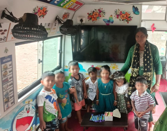 Zur StartseiteIm Schulbus, wo die jüngsten Kinder vor Ort auf die Schule vorbereitet werden, wird der Geburtstag eines kleinen Mädchens mit einer Süßigkeit gefeiert, worüber sie sich sehr freut.